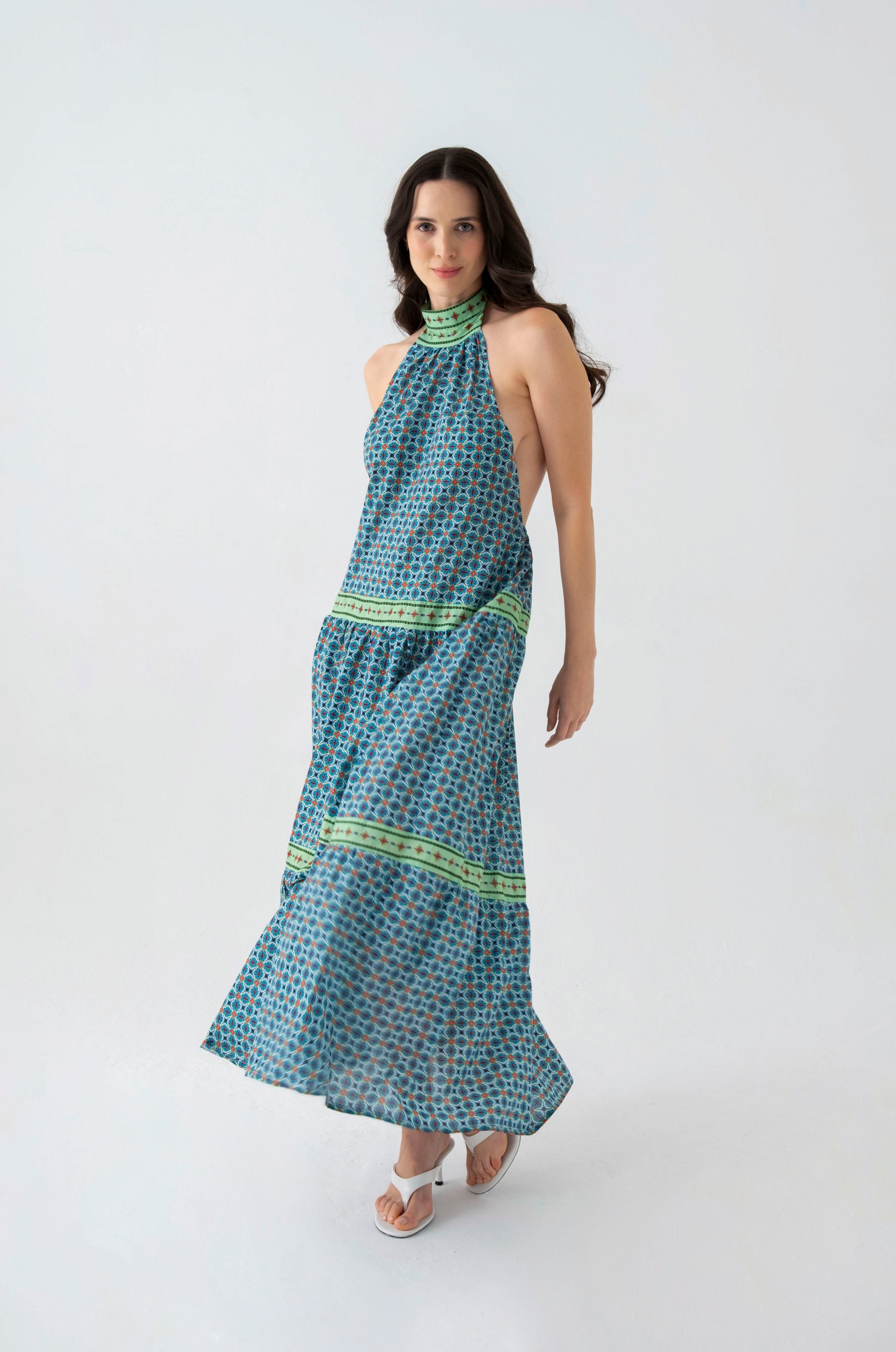 Sırt dekoltesi ile tasarlanmış elbise, su taşı detayı ile şık bir görünüm sunmaktadır.