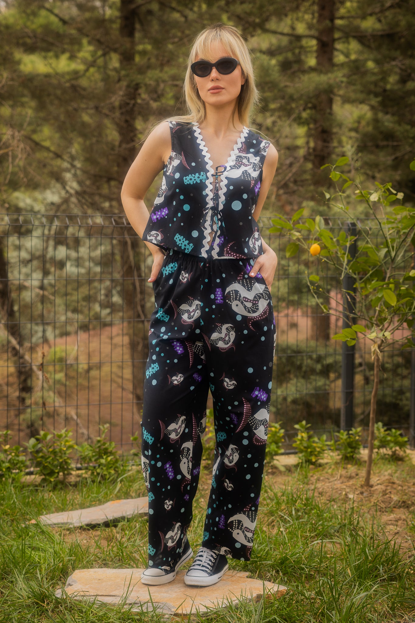 Siyah Balık Desenli Su Taşı Detaylı Yelek