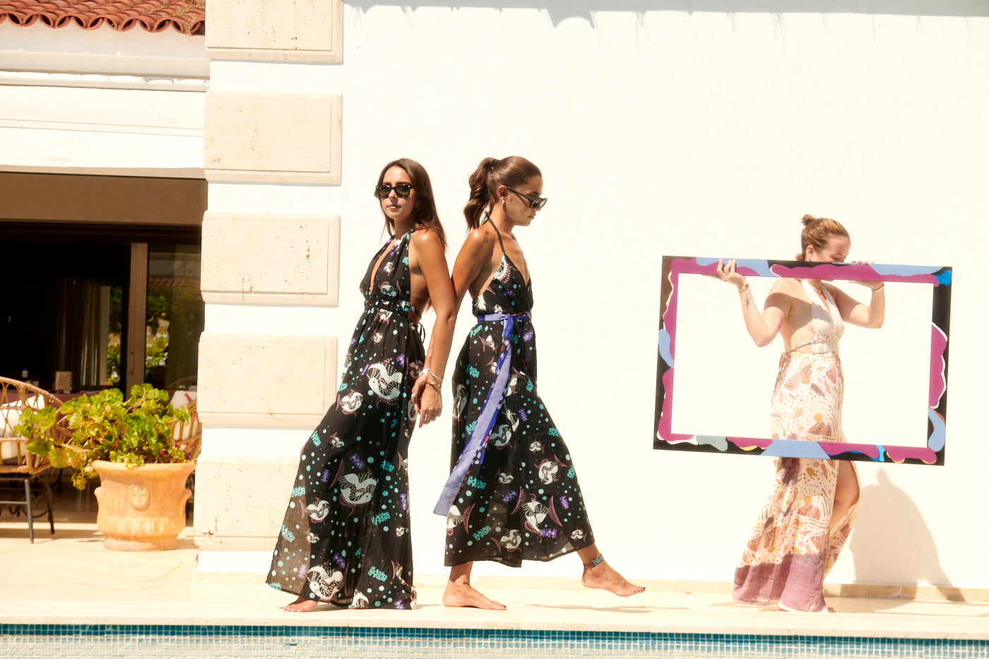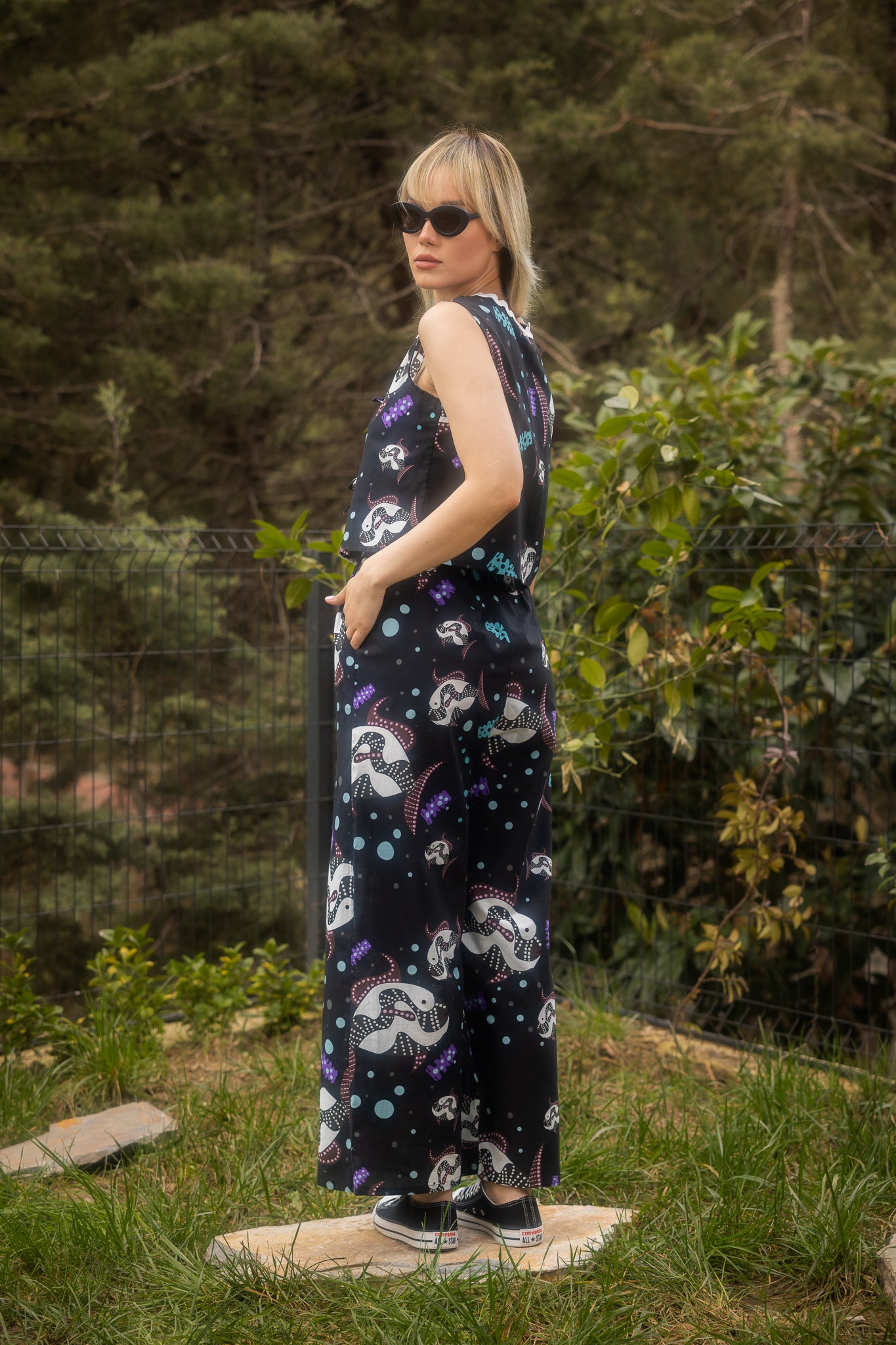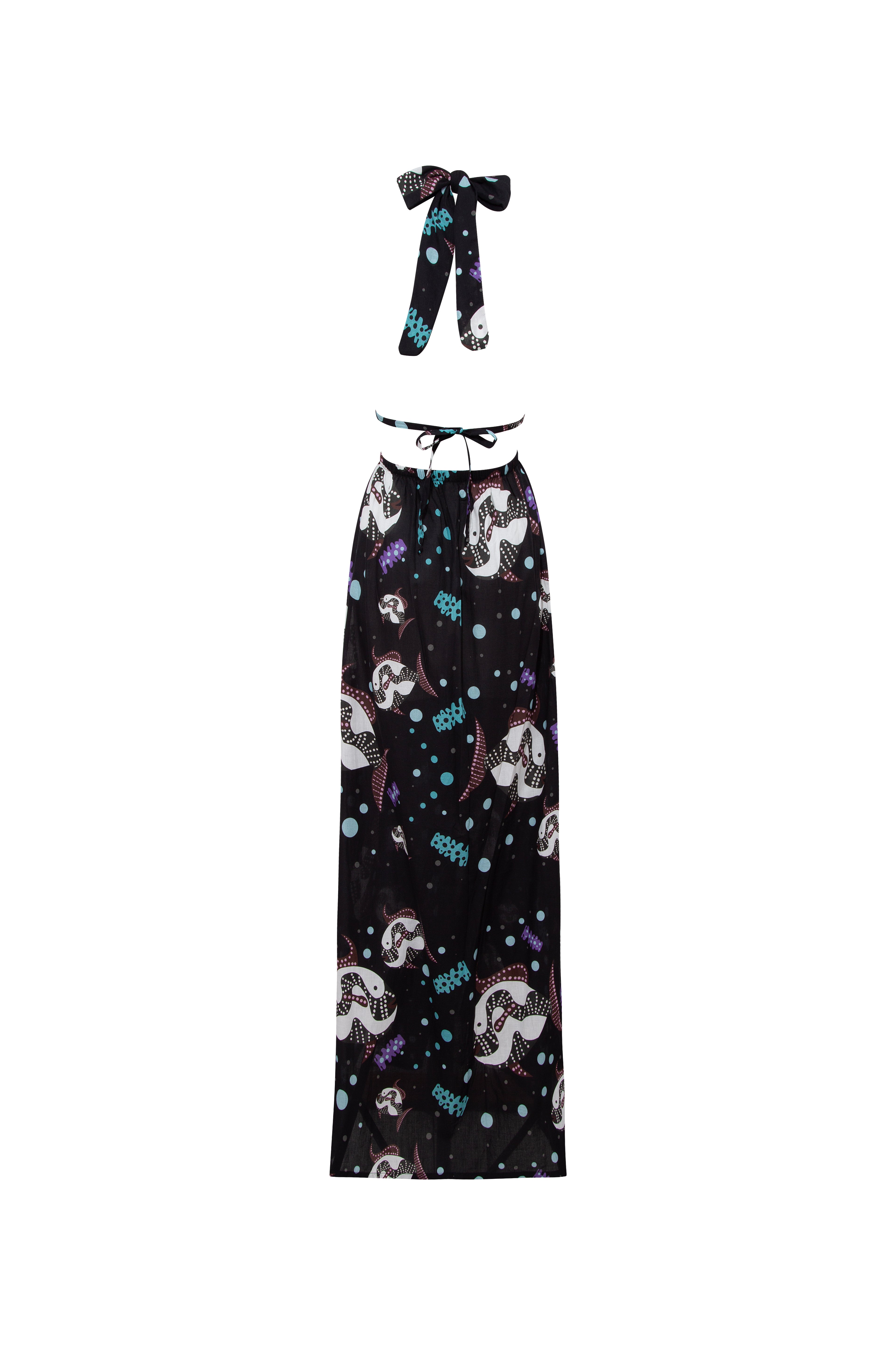 Siyah Balık Desenli Boyundan Bağlamalı Uzun Elbise