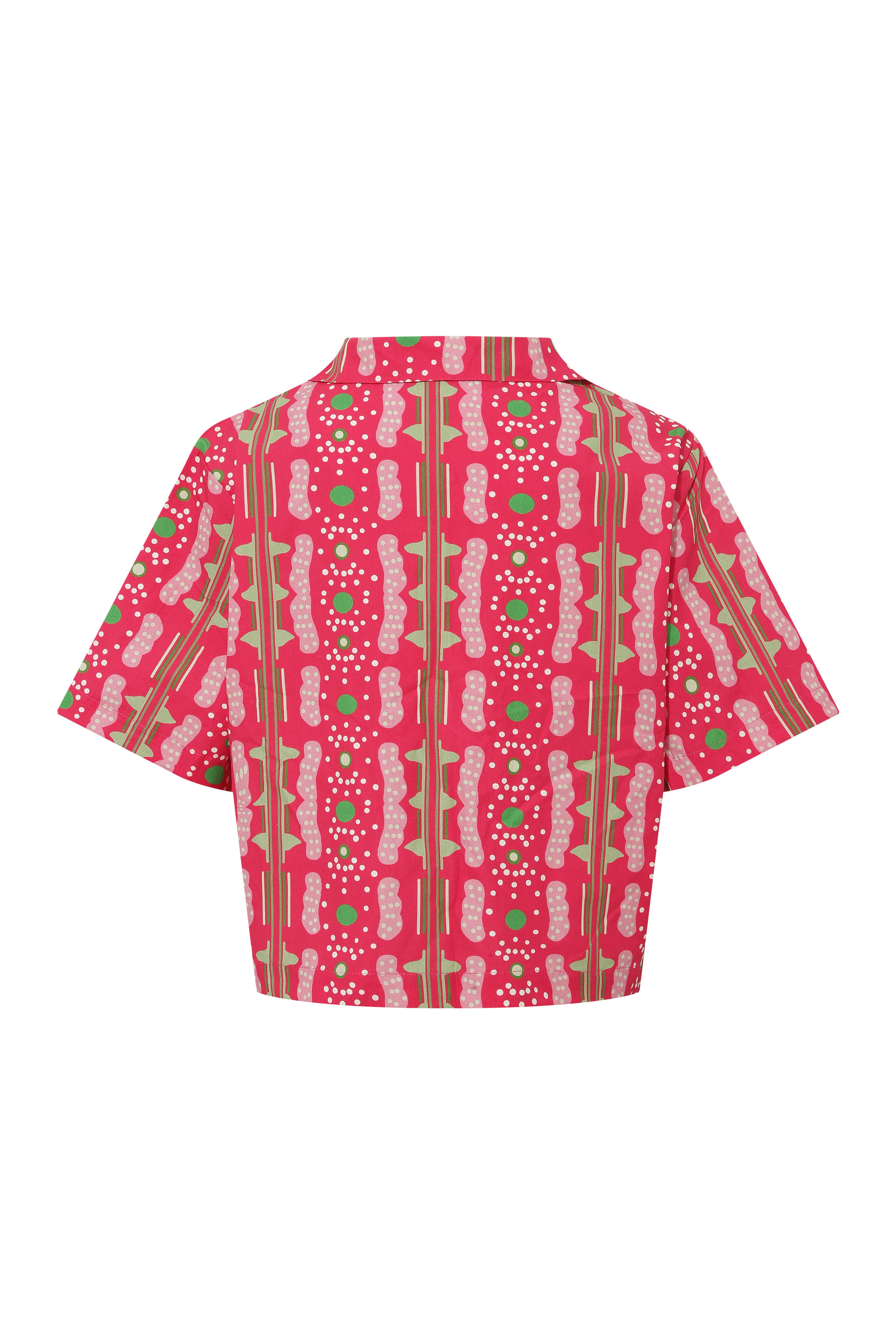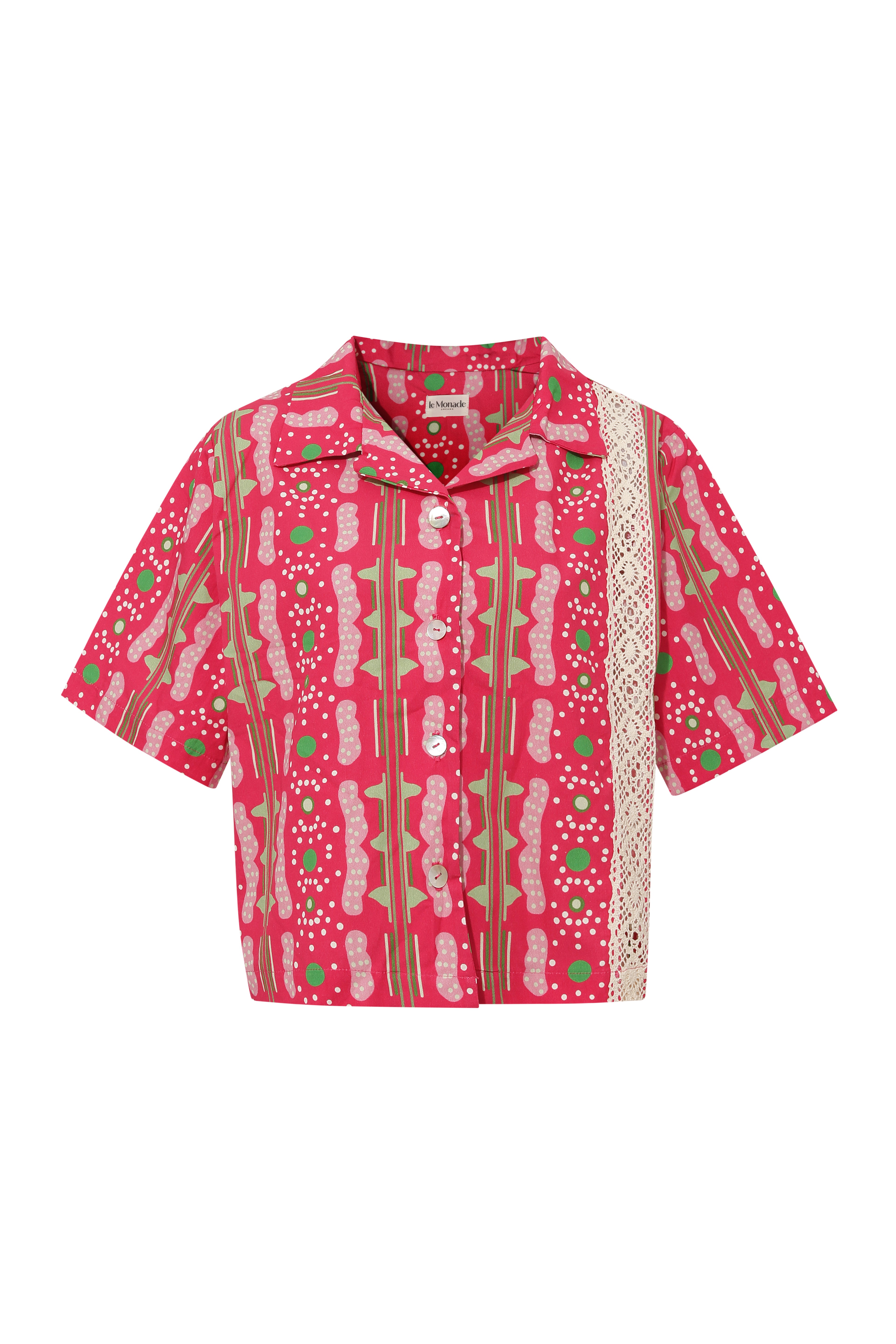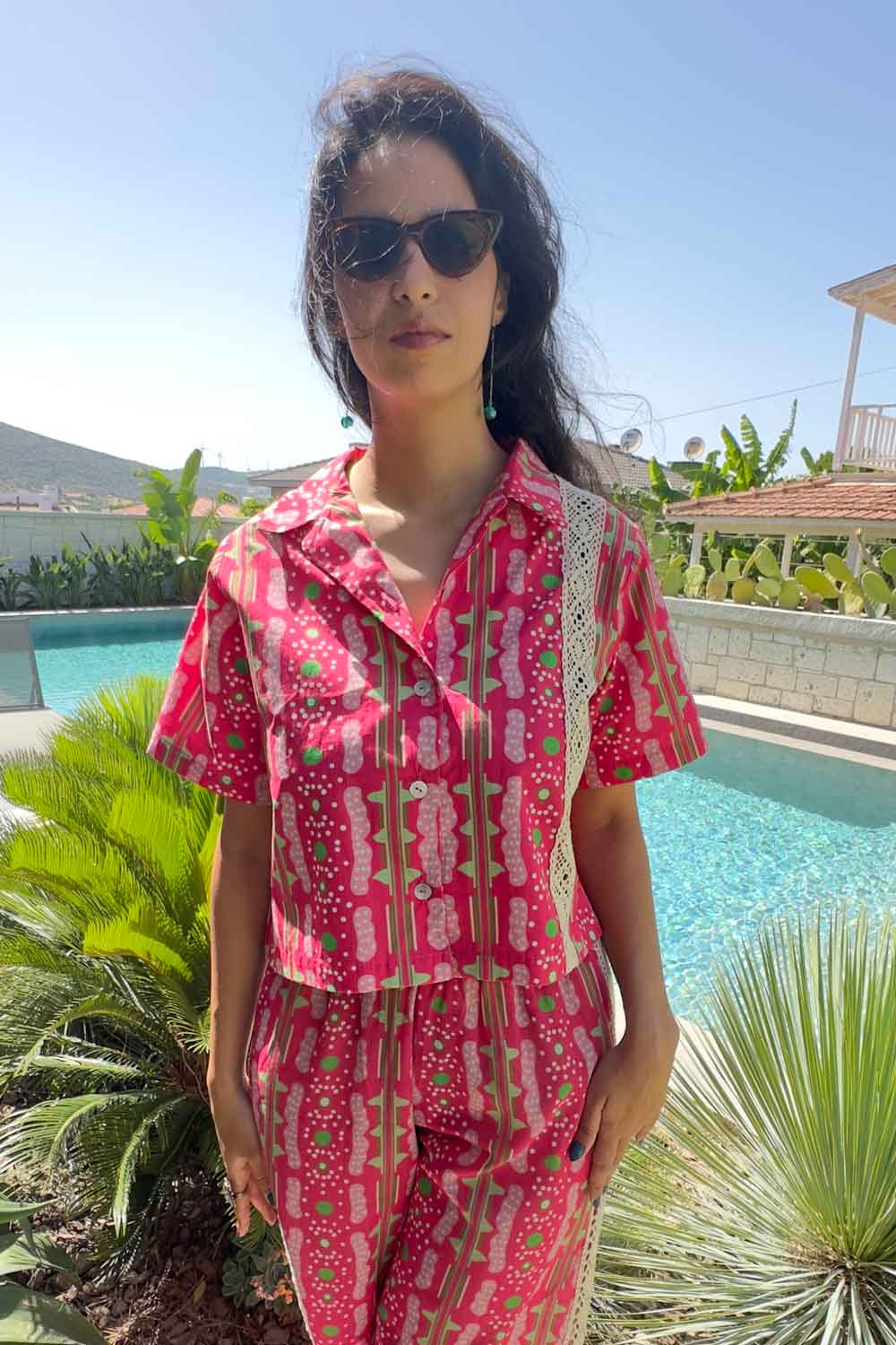 Pembe Bulut Desenli Kopanaki Detaylı Kısa Kol Gömlek