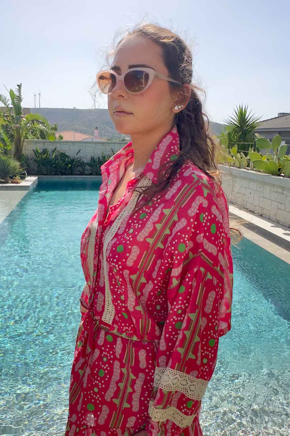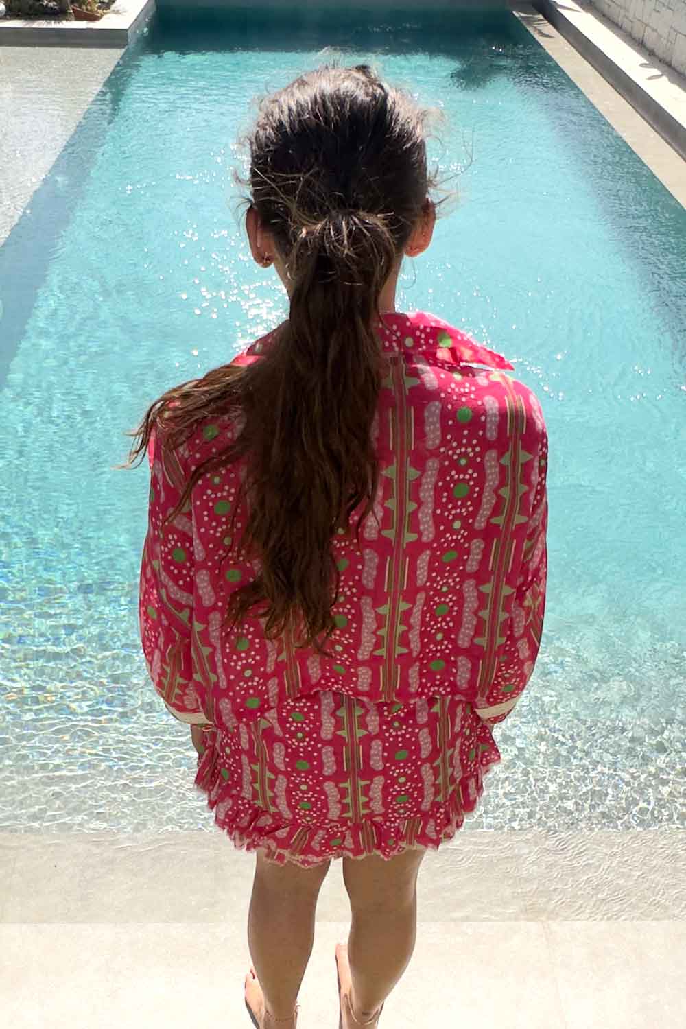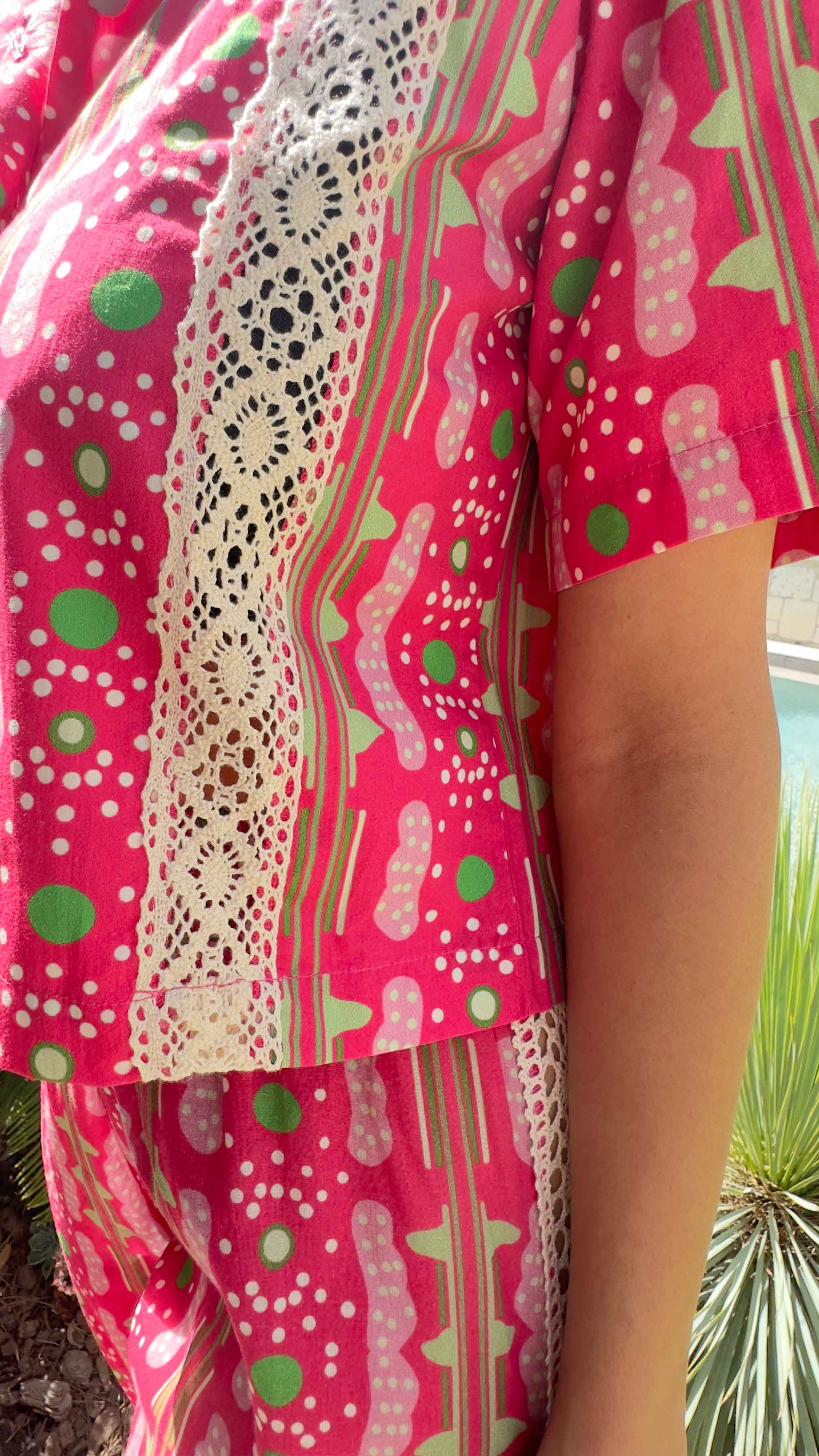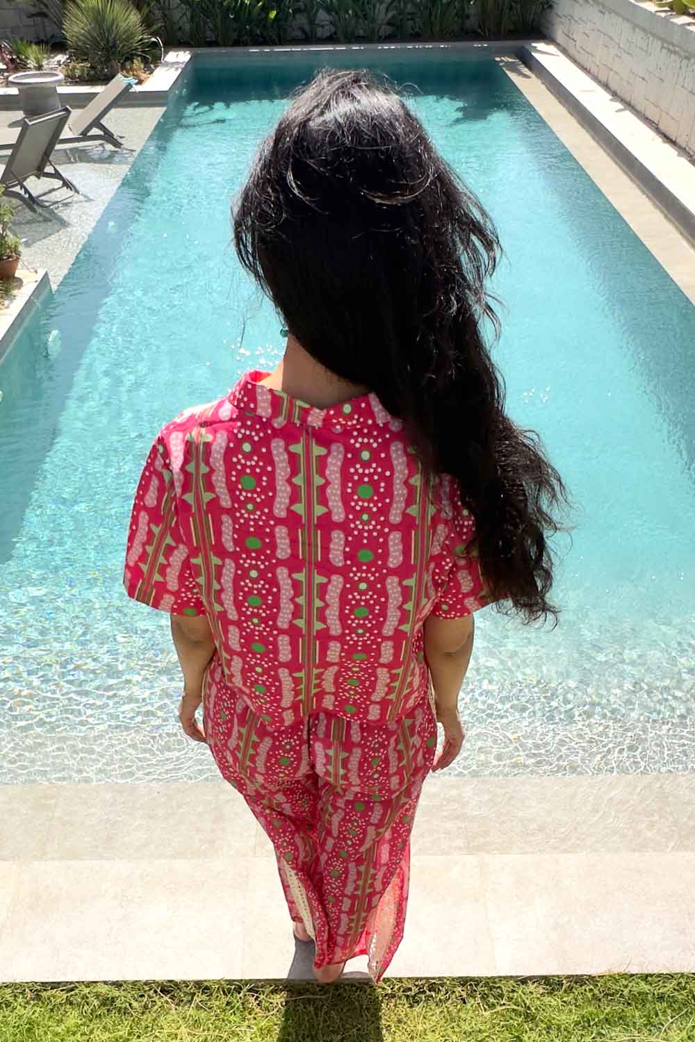 Pembe Bulut Desenli Kopanaki Detaylı Kısa Kol Gömlek