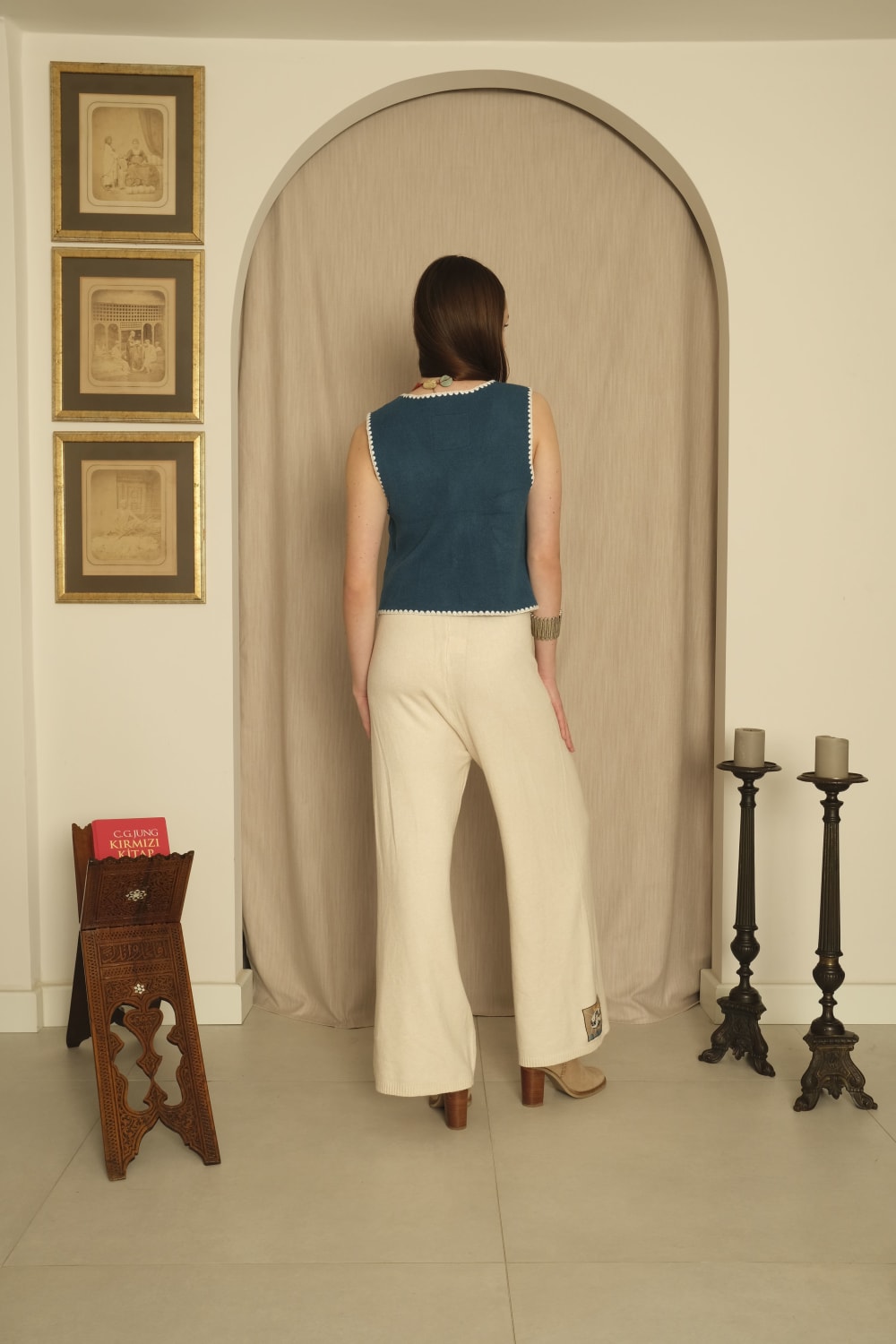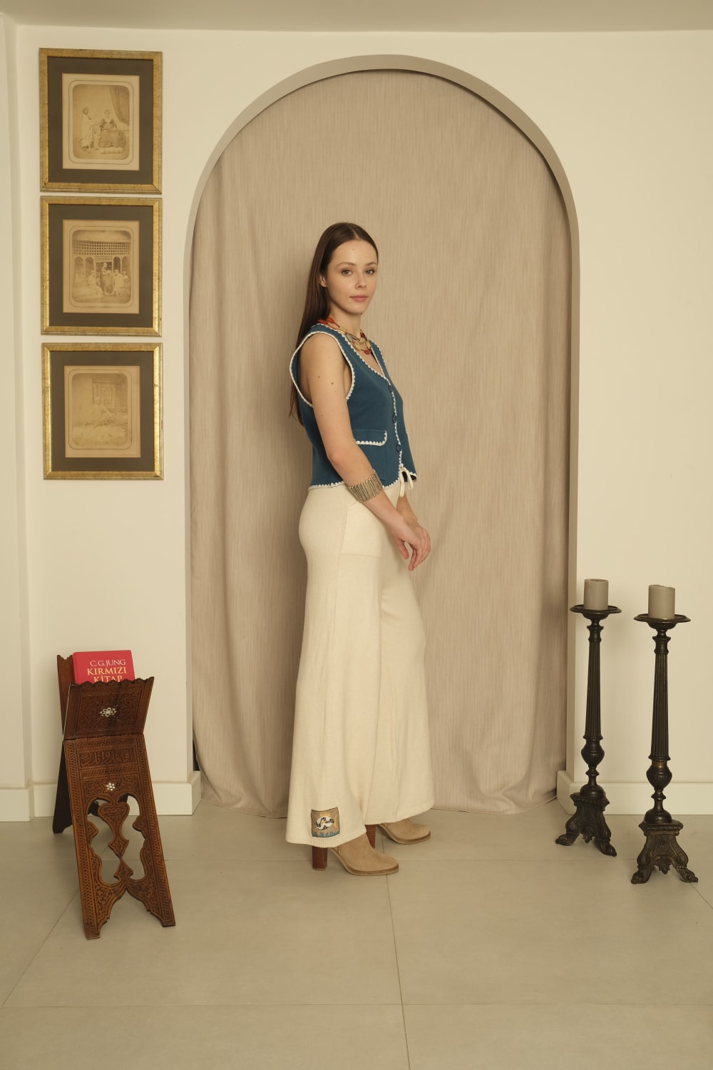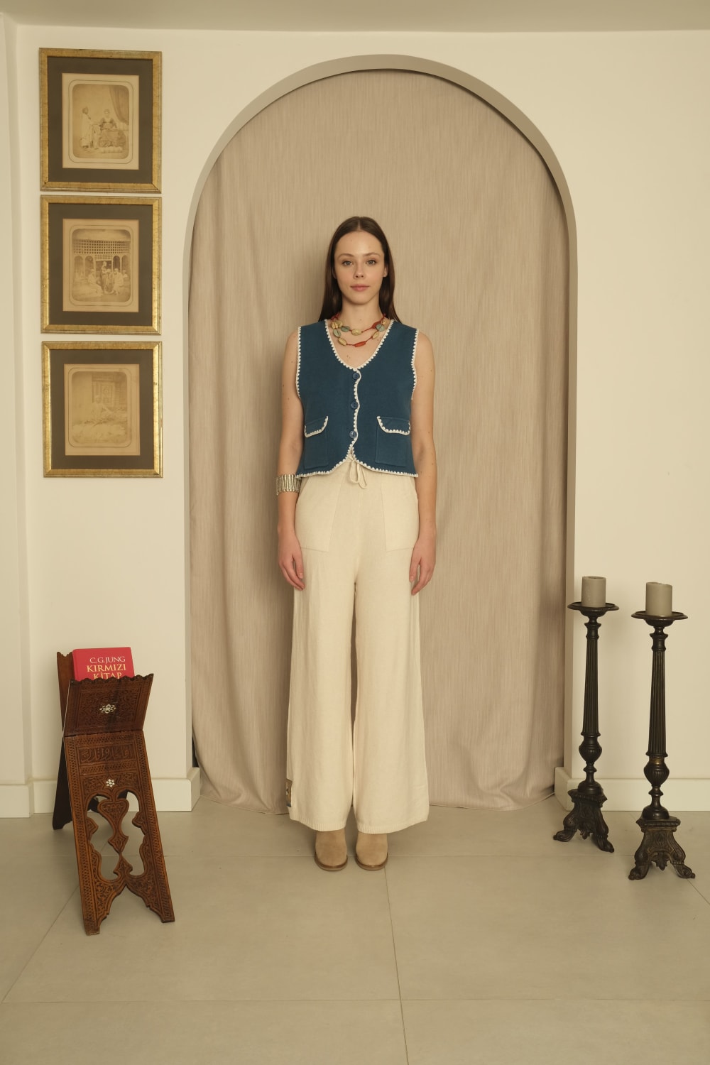 Triko İngido Ekru Sıçandiş Nakışlı Yelek