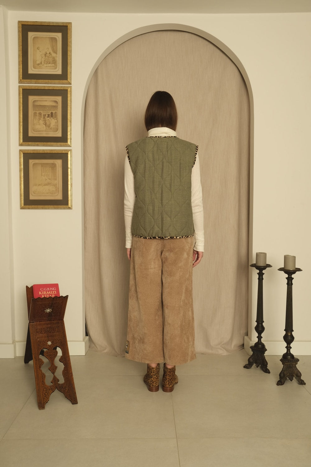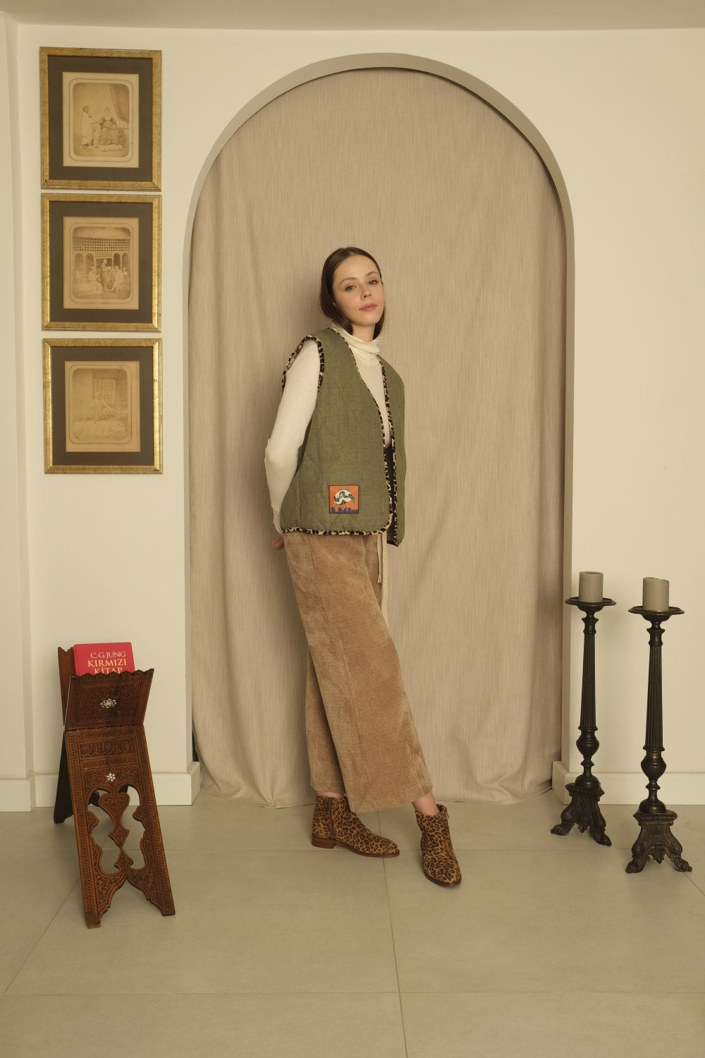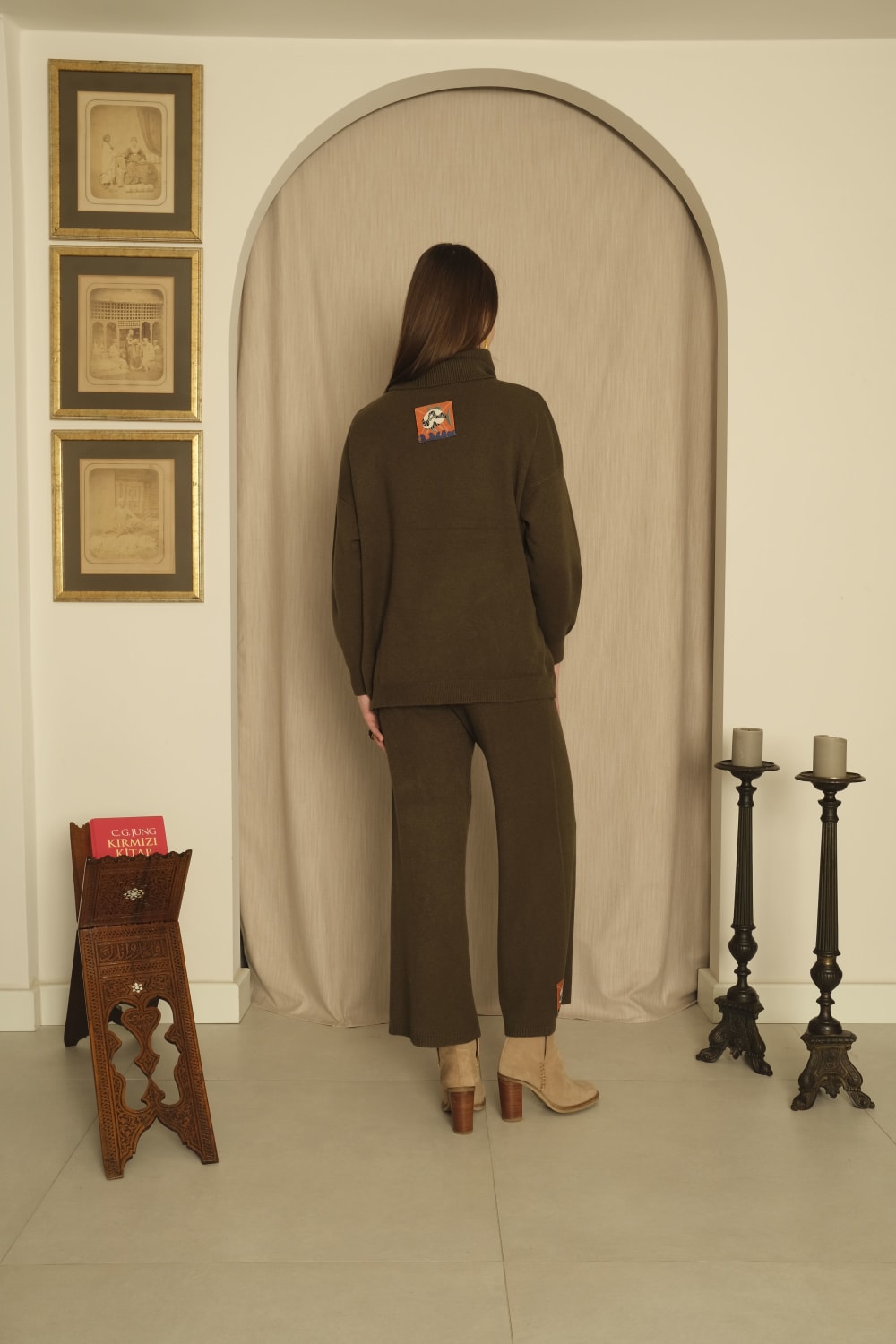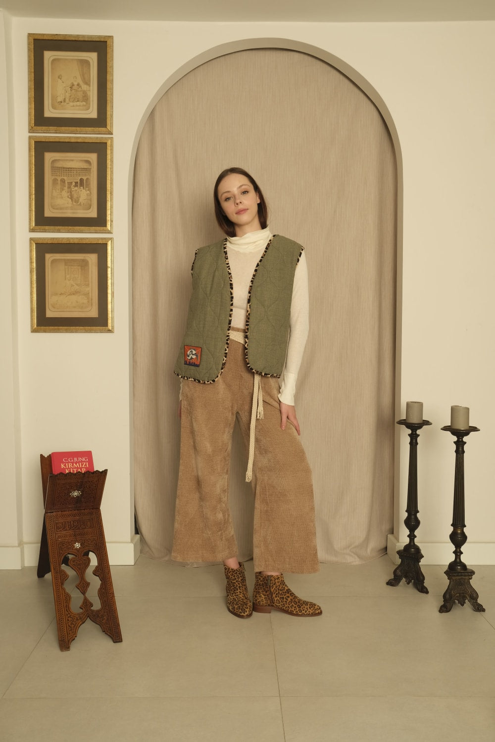 Triko Haki Ekru Sıçandiş Nakışlı Yelek