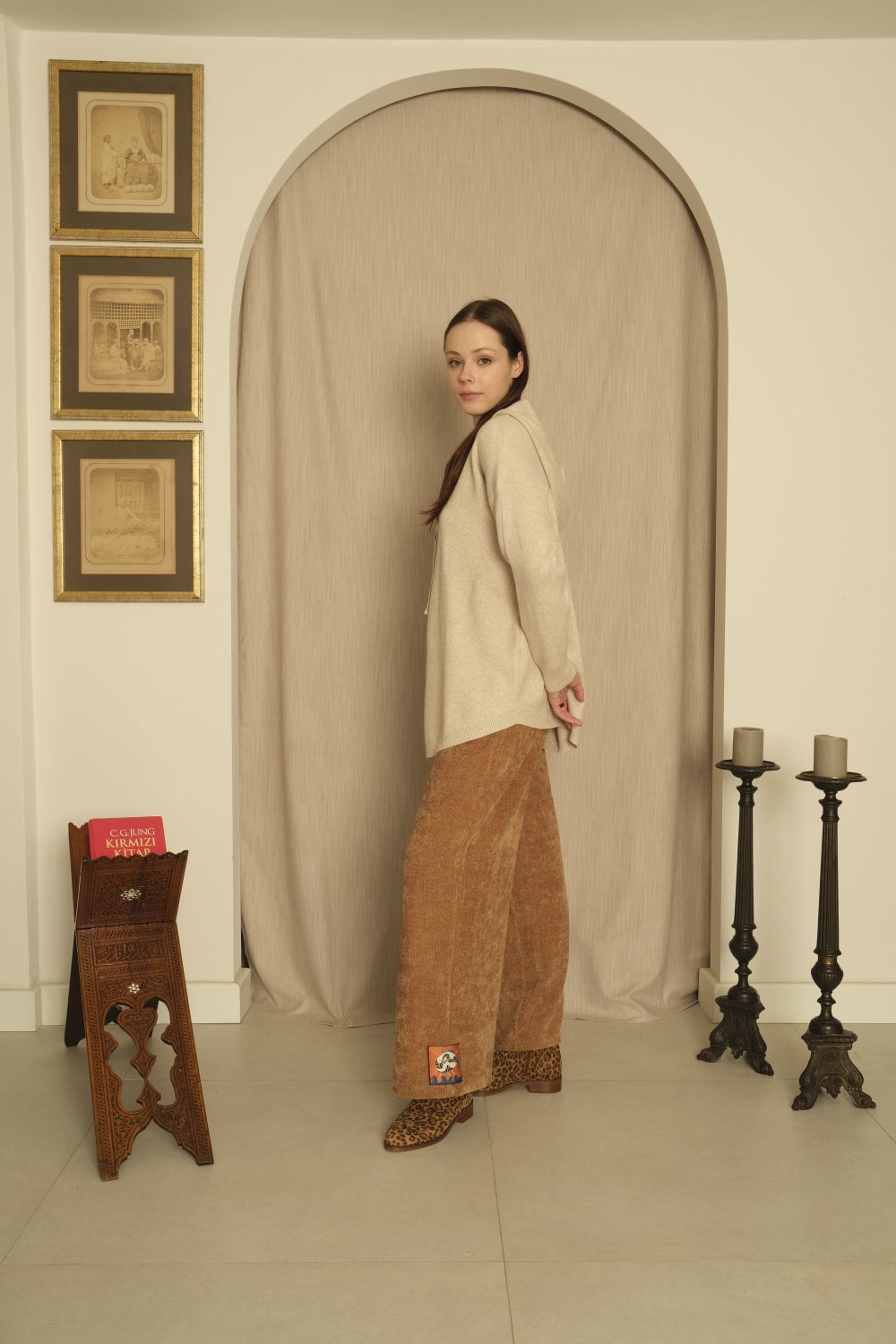 Şönil Patch Kemer Detaylı Bej Pantolon