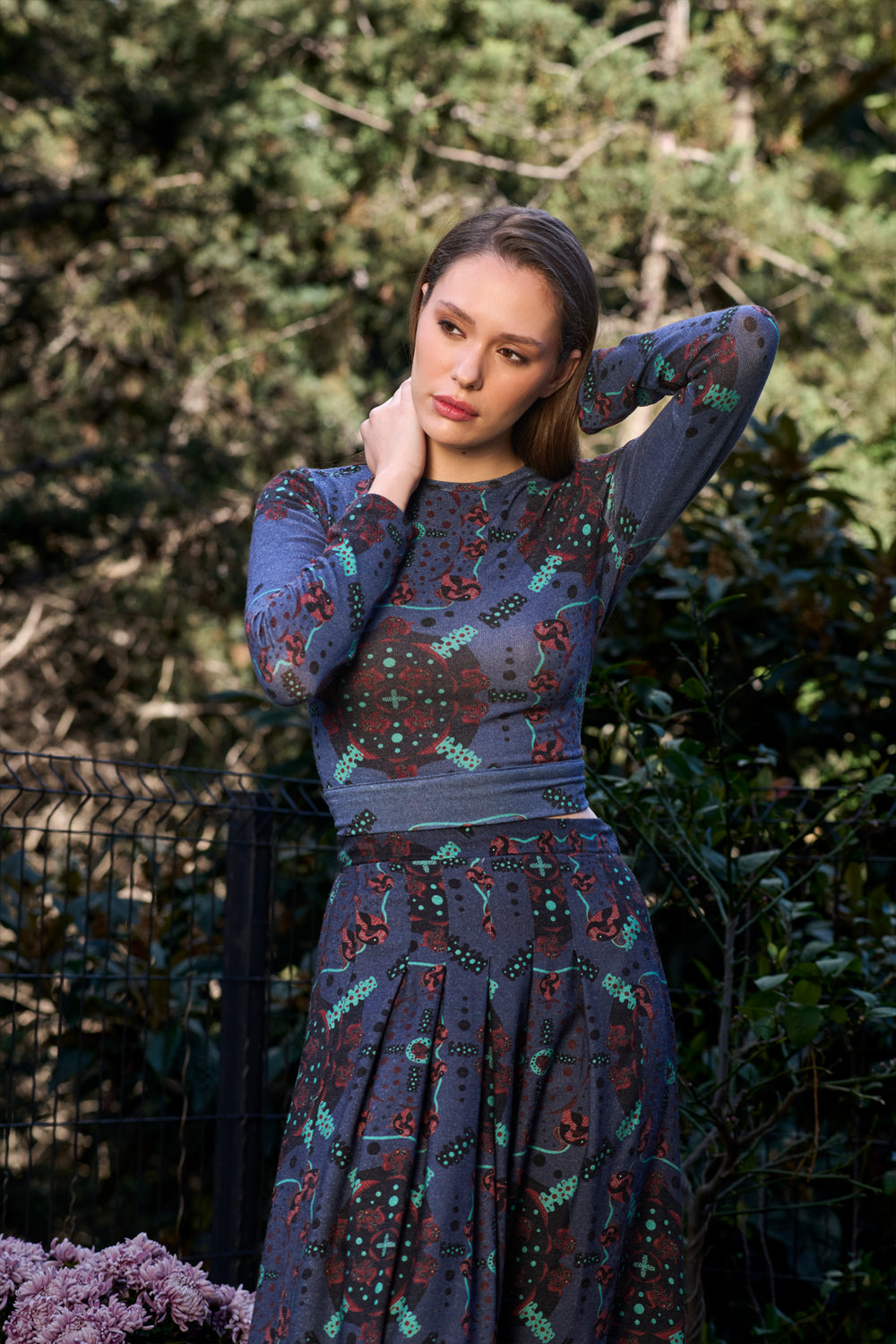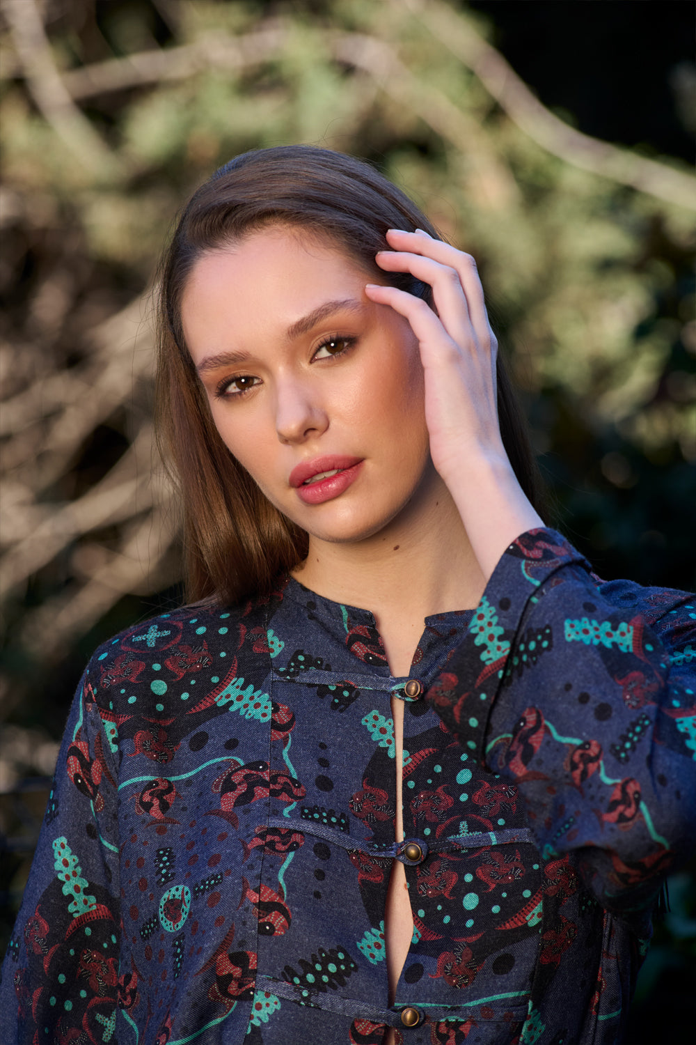 Kahve Ağaç Desenli Sırtı Saçak Detaylı Bluz