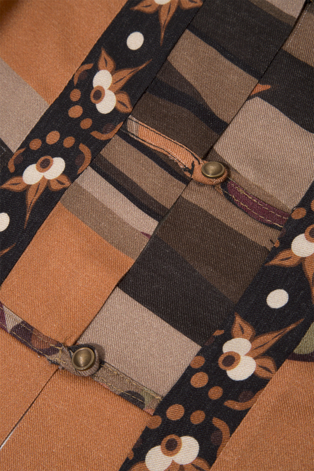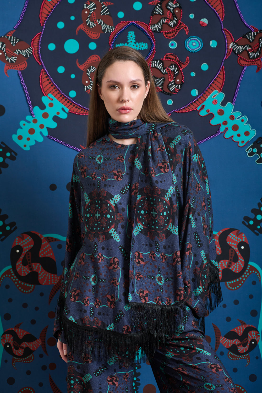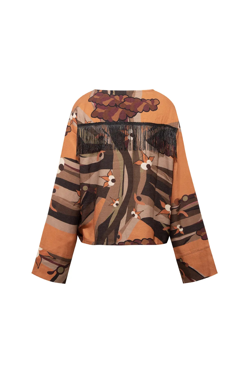 Kahve Ağaç Desenli Sırtı Saçak Detaylı Bluz