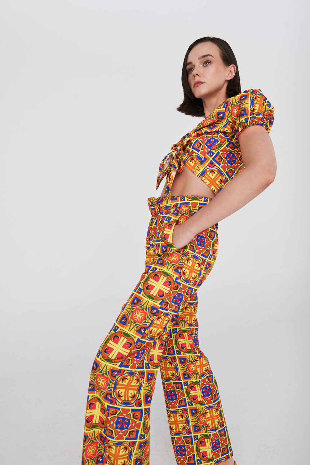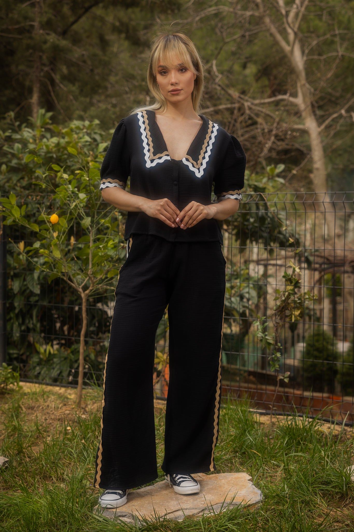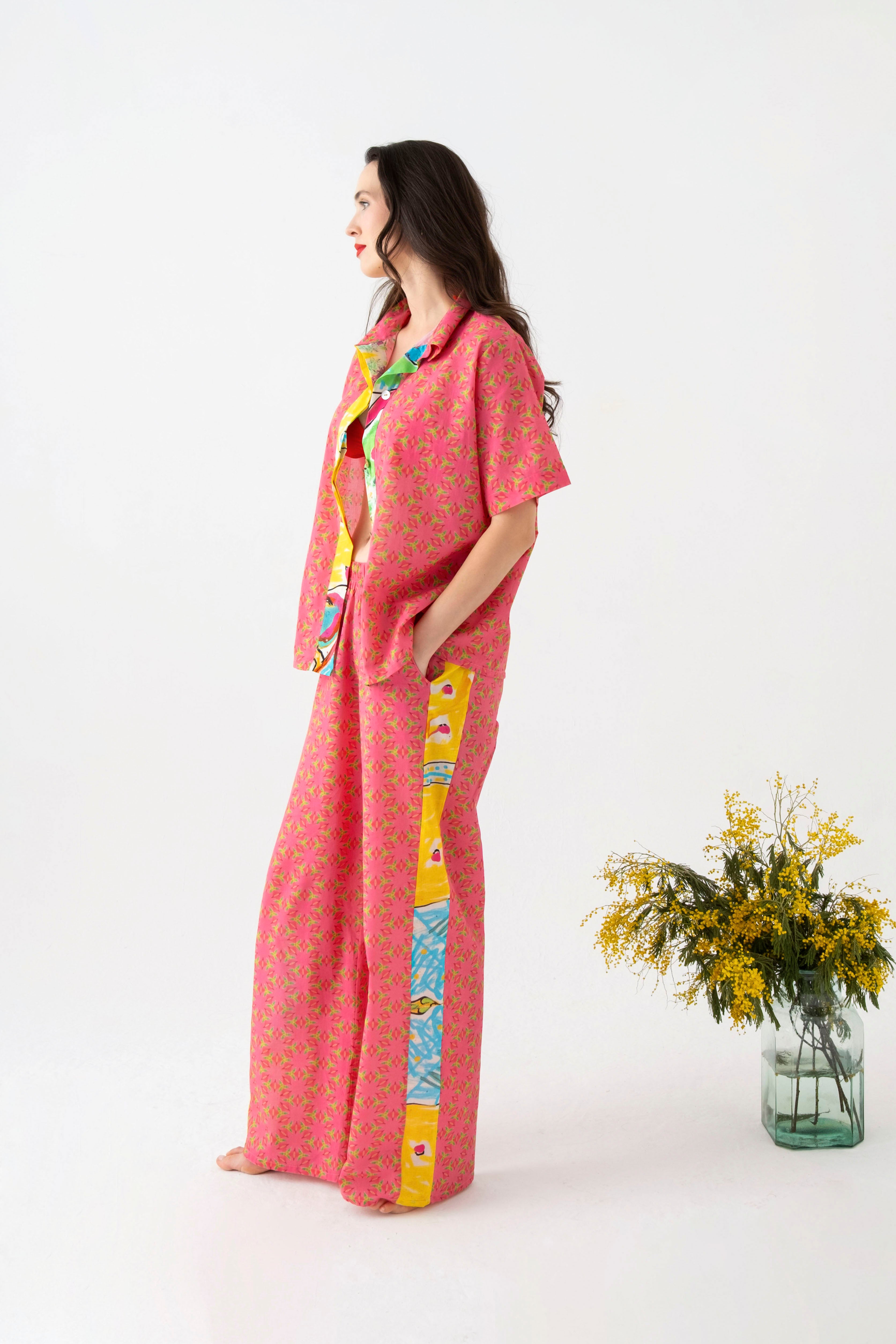 Lastikli yüksel bel ve salaş bir görünümü olan pantolon pile detayları ile şık bir görünüm sunmaktadır.