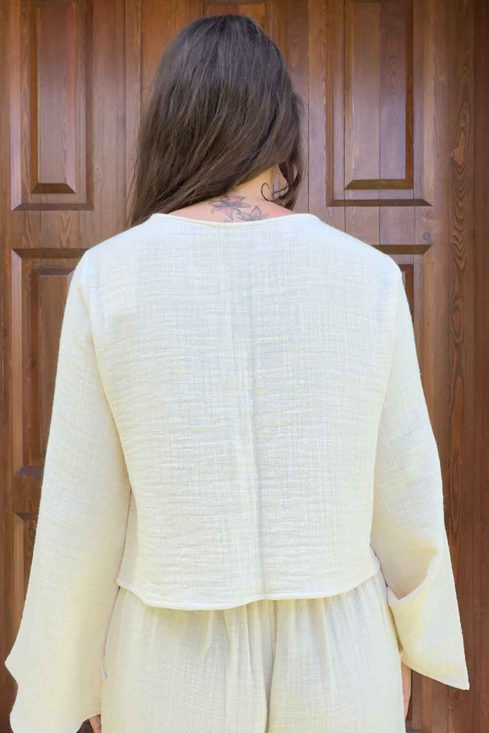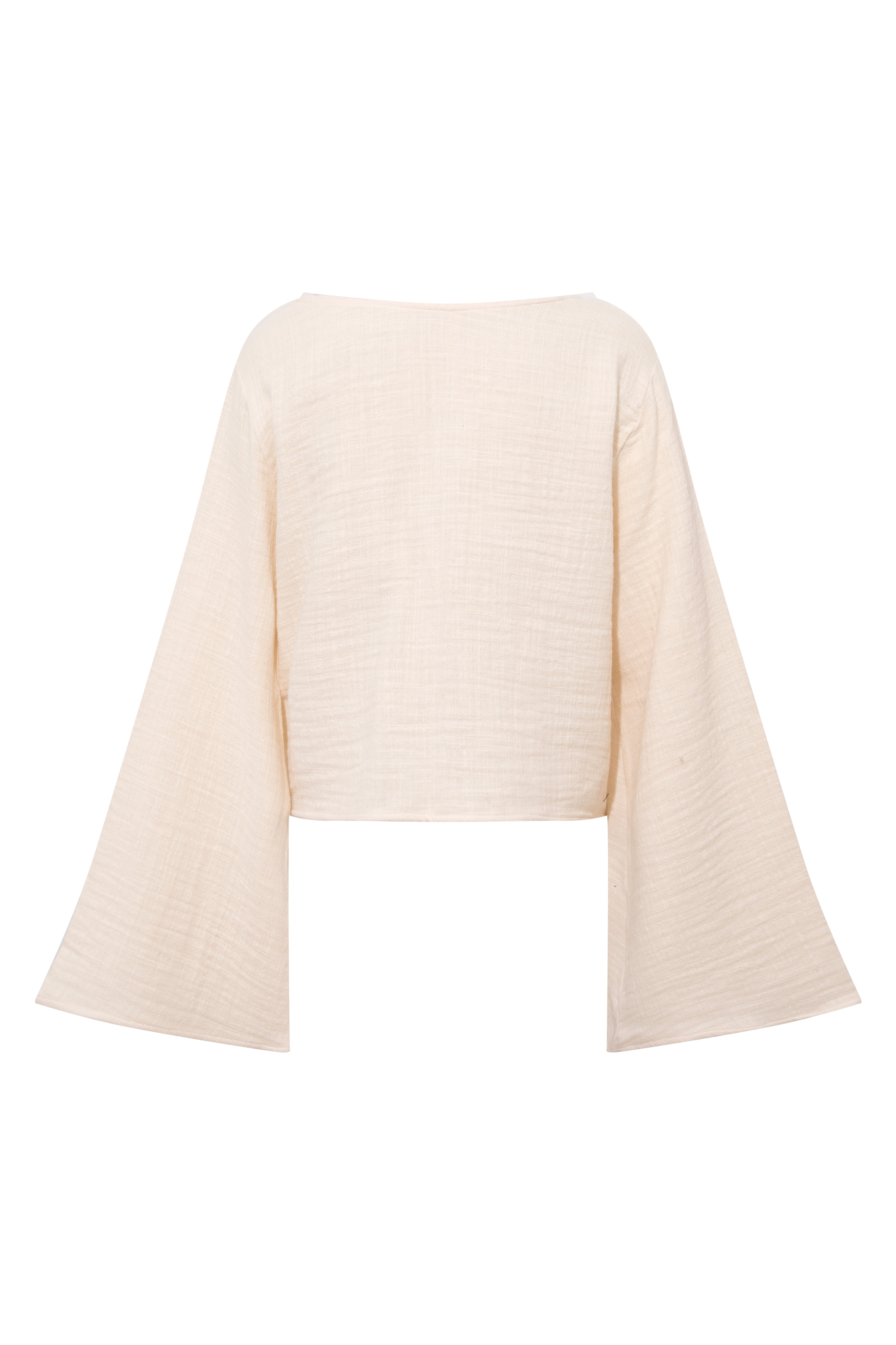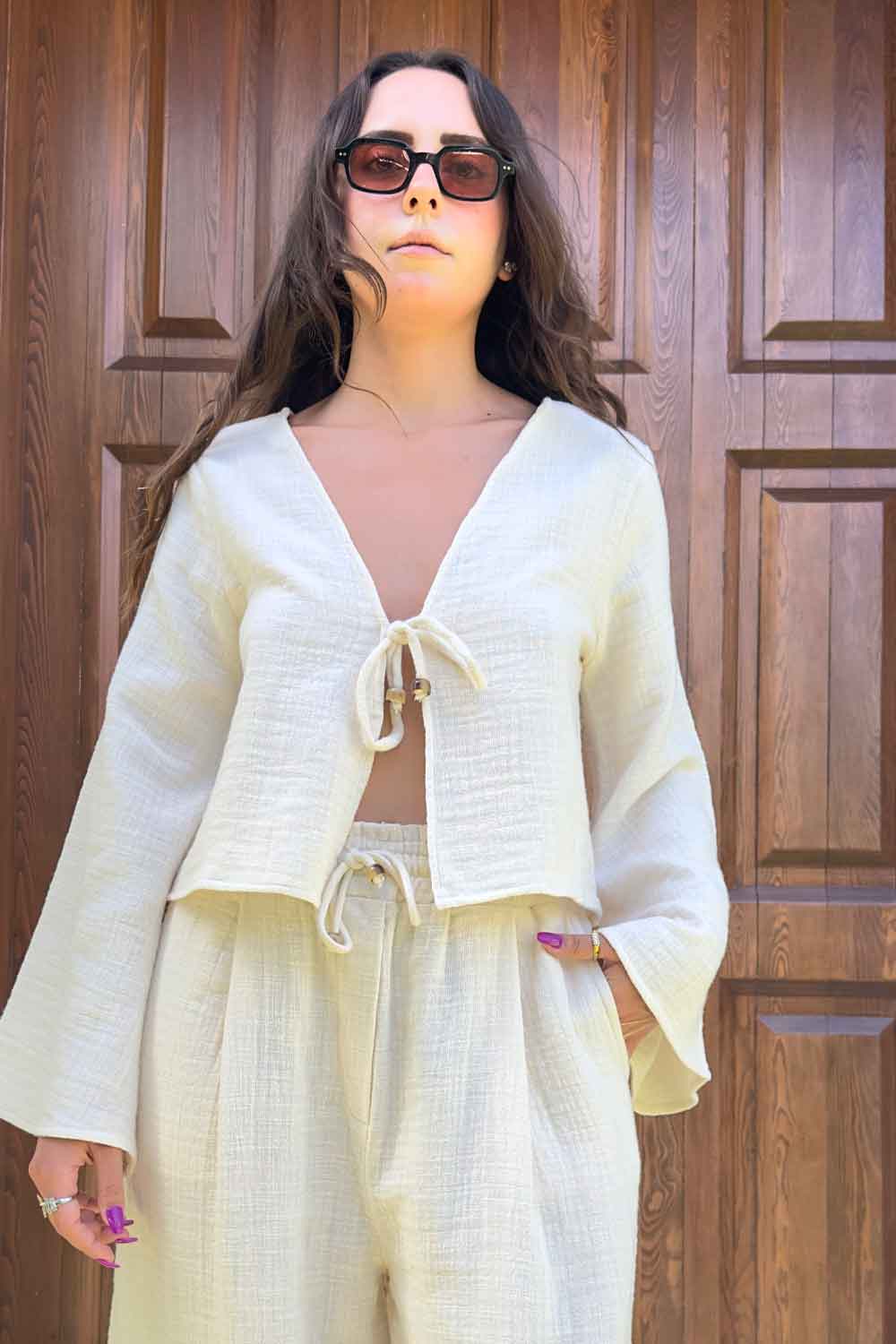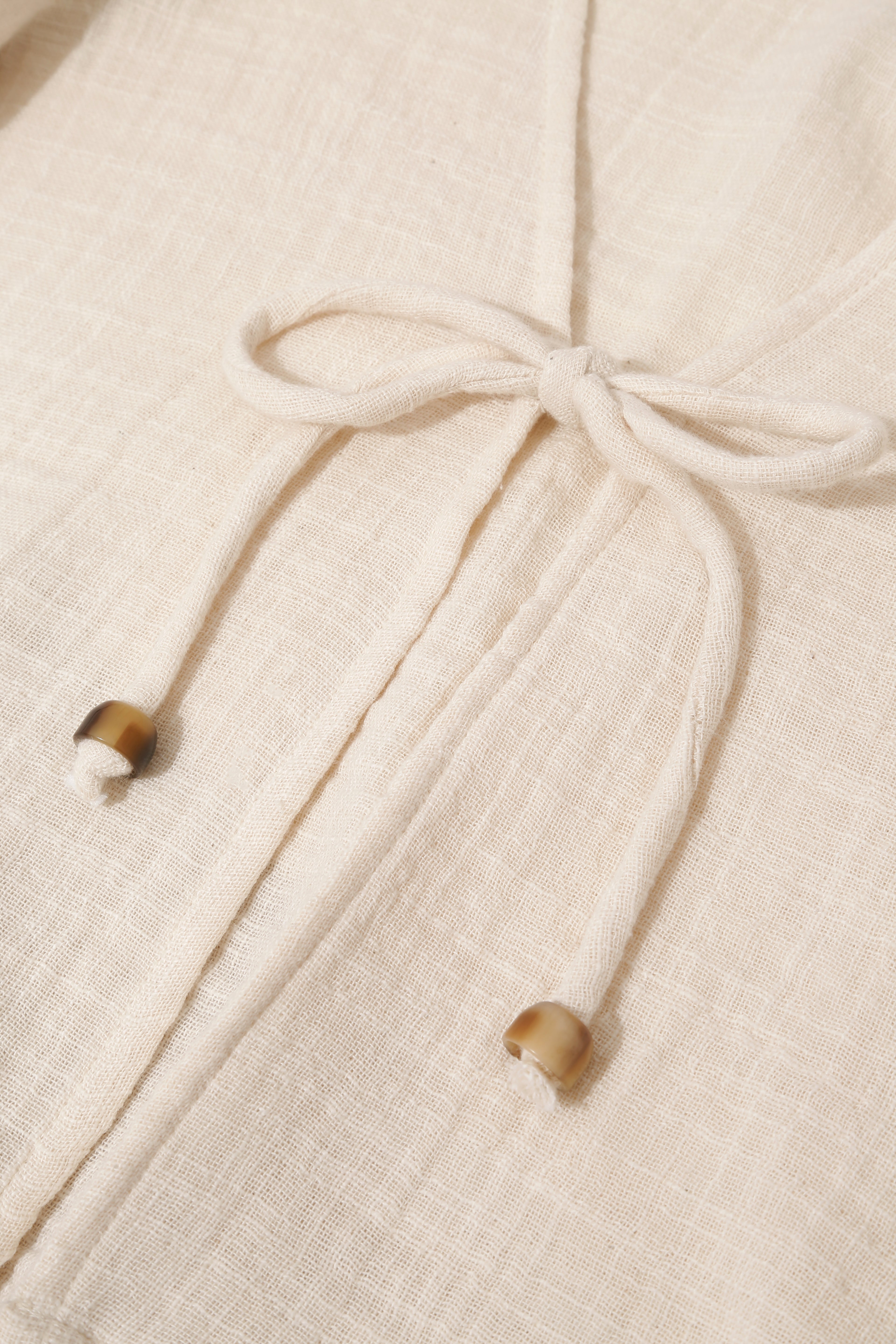 Keten Dokulu Önden Bağlamalı Ekru Bluz